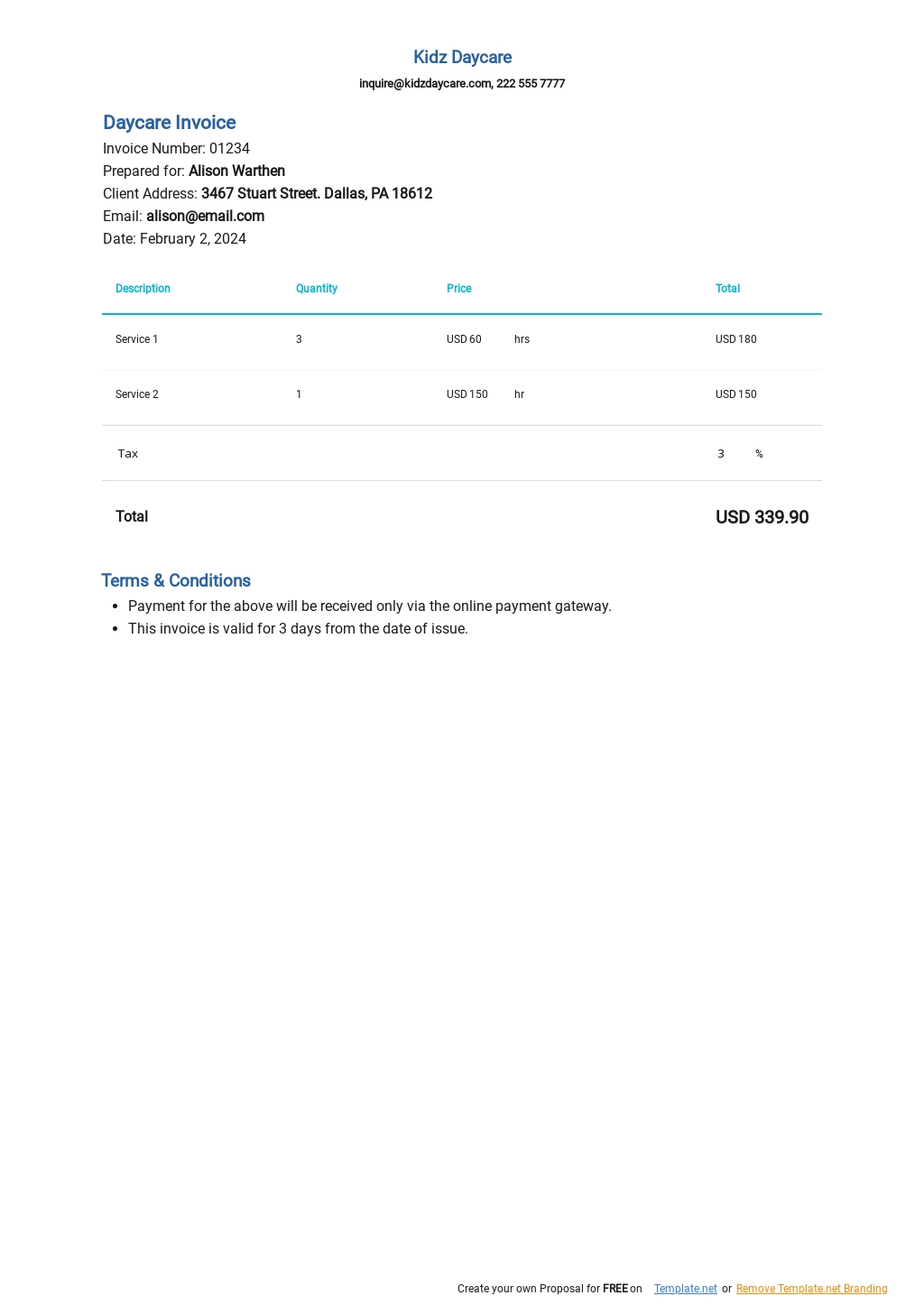 Webif your invoices need detailed information on products and services rendered, try this free itemized invoice template. The child care industry in the united states is worth more than $33 billion, so if you run a daycare business, you could make some serious money. In addition, it notifies the parent of … Available in word, excel, pdf, and other formats. Create free invoices download free daycare invoice templates along with the primary goal of the child's personal growth and development, you should start chasing charges instead of payments. Click the image below to download our free template. You can even export or email your invoice in a convenient file like a pdf format and send it directly to your client for added convenience. Still, bookkeeping is also important. The editable pdf is ready to use as soon as you download! This invoice lets a business or individual bill for care, much like babysitting, although daycare usually includes the feeding and exercising of the child. Webdownload the daycare invoice template to formally request payments for child care services. But it definitely takes up most of your effort and attention. Websteps to create a daycare invoice template;